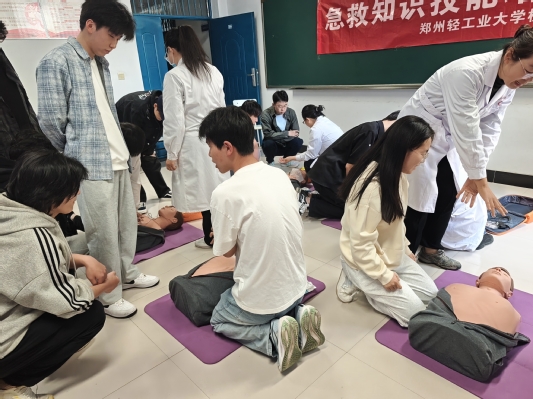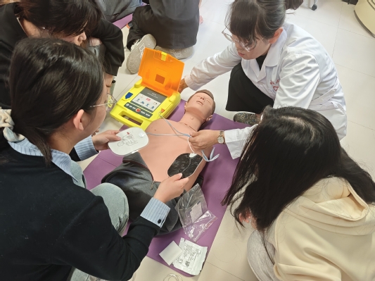 本次实训特邀校医院专业医师主讲,采用理论讲解+现场实操+情景模拟相结合的方式进行。培训中,医师围绕紧急救护核心流程,系统讲解了现场评估、科学呼救、规范施救等关键环节,重点对心肺复苏(CPR)的按压部位、深度、频率及气道开放等操作要点进行细致拆解,并分步演示自动体外除颤器(AED)的使用流程。